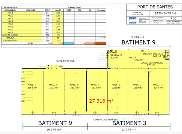 Le bâtiment est EMBRANCHE et dispose de 7 portes sectionnelles côté voie ferrée.