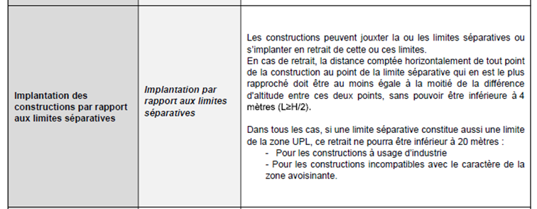 Les règles du PLU zonage UPL permettent de construire en limite séparative ou de s’implanter en retrait (extrait du PLU ci-dessous)